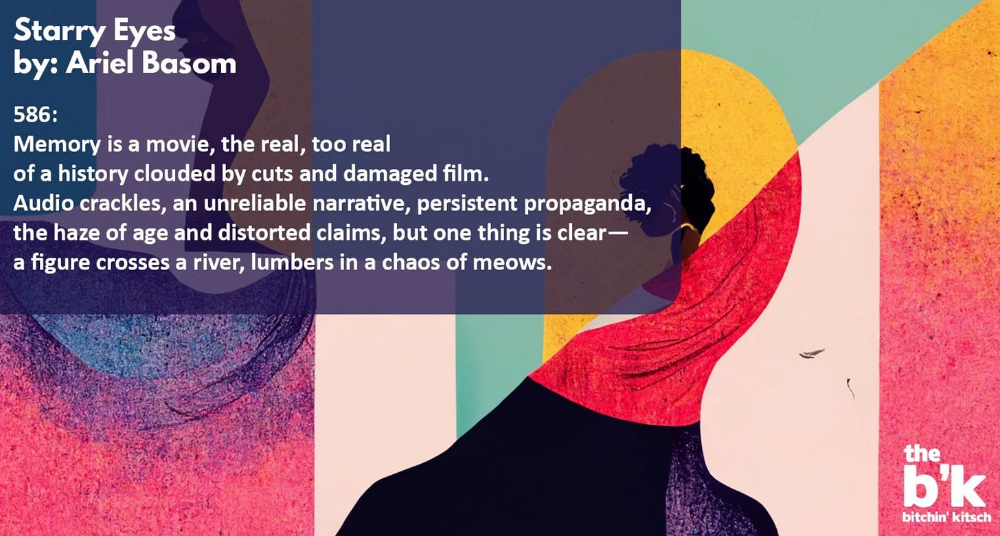 Starry Eyes is previously published and you can check it out by looking through my writing on my website where you can also find some other digital publications: https://www.arielbasom.com/writing. It was published by Bitch’n Kitsch: Volume 14; Issue 1, back in 2023. I am very fond of this publication and it is an honor to be a part of it.